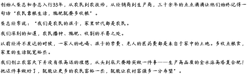 深圳農富天下生態工程有限公司,集新型高塔復合肥、硝基復合肥、控釋肥、大量元素水溶肥等各種功能性肥料等新型配方研發、生產、銷售為一體,現有新型高塔復合肥生產線、氨化復合肥生產線,擠壓顆粒肥生產線,大量元素水溶肥生產線共五條生產線,年產能一百余萬噸。以“農富天下”...