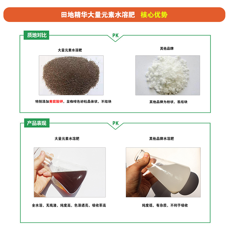 大量元素水溶肥料采用磷酸二氫鉀或礦源黃腐酸鉀為原料,特別添加海藻酸與螯合微量元素,根據作物生長階段所需營養設計配方,適合多種施肥方式,省時省力。